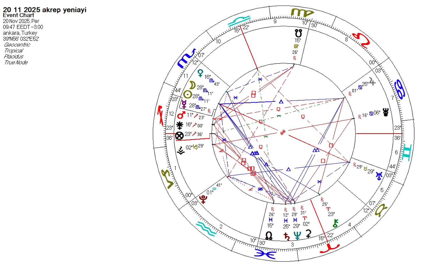 Yeni ay Türkiye’nin 11. evine yerleşiyor bu da yine meclisten çıkacak kararların önemli olacağını da bize gösteriyor. Türkiye üzerinde normal haritada 11. eve düşüyor o yüzden de parlamento, meclis, müttefikler, ortaklıklar, şirketlerle yapılacak her tür iş karşımıza gelebilir ama Türkiye haritasına bindirdiğimizde de 5. evine düşüyor. Çocuklar, gençler, eğitim konuları, borsa, spekülasyon, gençlerin eğitimi ile ilgili konularda verilecek kararlar öne çıkacak. 6. ev girişi olduğu için sağlık alanları, iş hayatı ile ilgili konular da önemli olacak. Meclisten çıkan kararlara çok çabuk tepkiler de vereceğimiz bir dönem olabilir. 17 Kasım, 23 Kasım ve 27 Kasım tarihleri Türkiye için kadersel dönüm noktaları. Bunlar önemli çünkü 23 Kasım’da Mars’ın Uranüs’le sert açısı devrede olacak. İsyanlar, devlet kademelerinde gösterilecek bazı tepkiler devreye girebilir. Ani oluşacak olaylara tepkiler de olabilir. Patlamalara dikkat edelim.